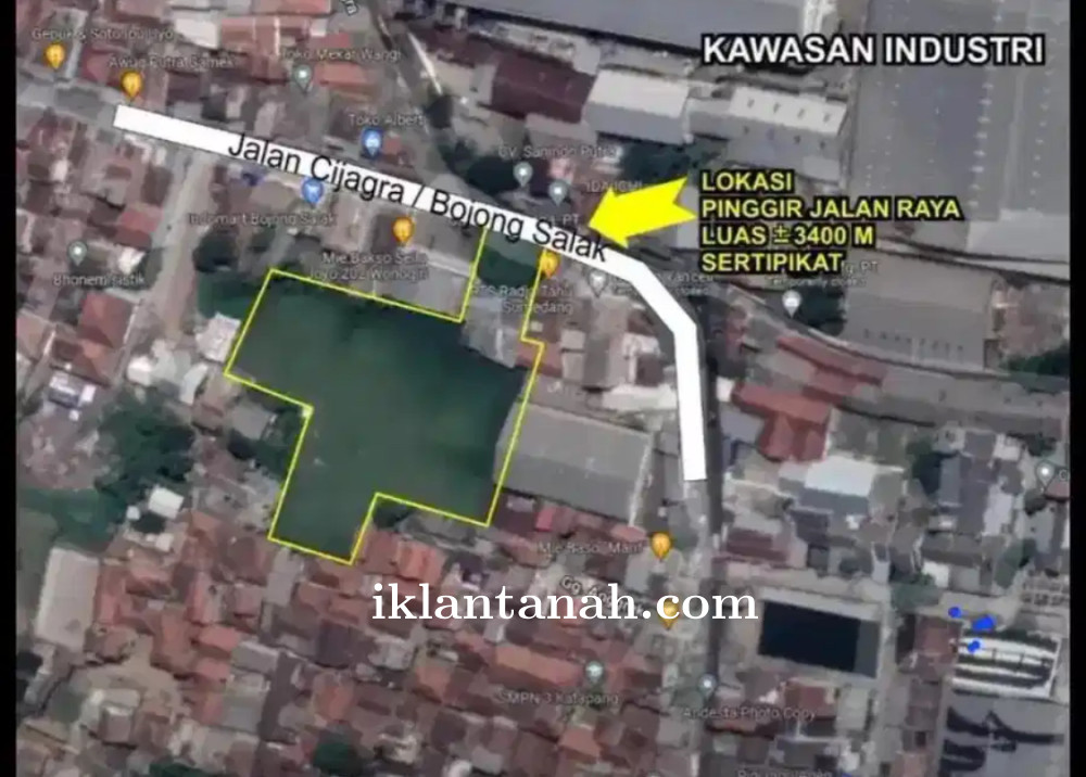 Dijual Tanah Strategis di Cilampeni – Kawasan Pabrik Lokasi sebelah Indomaret Bojongsalak, posisi sangat strategis di jalur industri Cilampeni. Bentuk tanah mengantung yang banyak disukai untuk pembangunan pabrik, memudahkan akses truk dan kendaraan logistik.